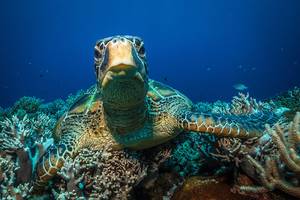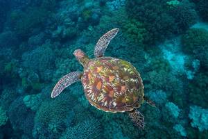 Récif de corail très sain. Ici tortues, nudibranches, grands mérous marbrés sont fréquemment rencontrés.
