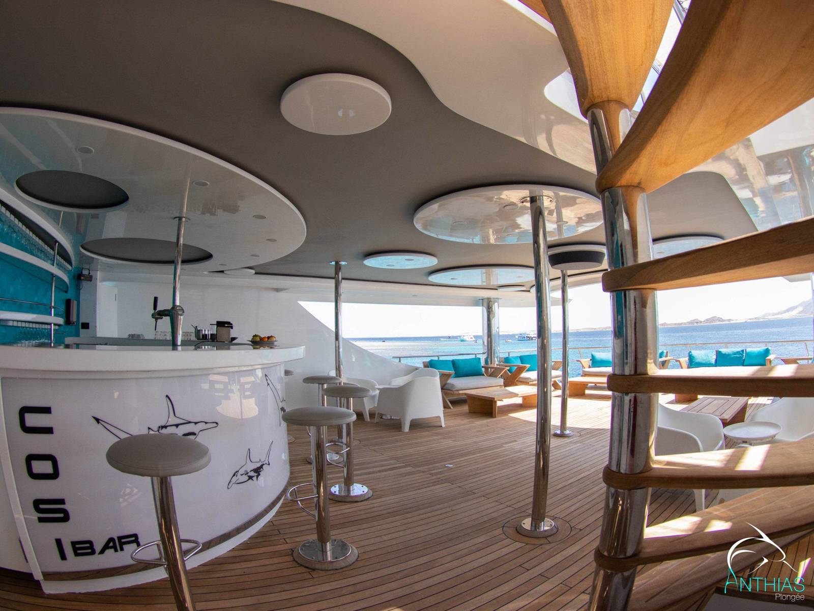Sur le sundeck, le COSI Bar propose enfin un véritable espace bar entièrement équipé : cocktails de fruits, café Nespresso, thés, chocolats, alcools variés et même une pompe à bière.