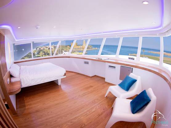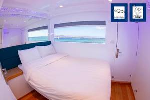| Hébergement | 7 cabines individuelles et 8 cabines doubles climatisées (climatisation individuelle) ave lits séparables et 1 suite VIP avec vue panoramique, chacune avec WC et douche privés. Serviette de toilette et peignoir fournis à chaque plongeur. |