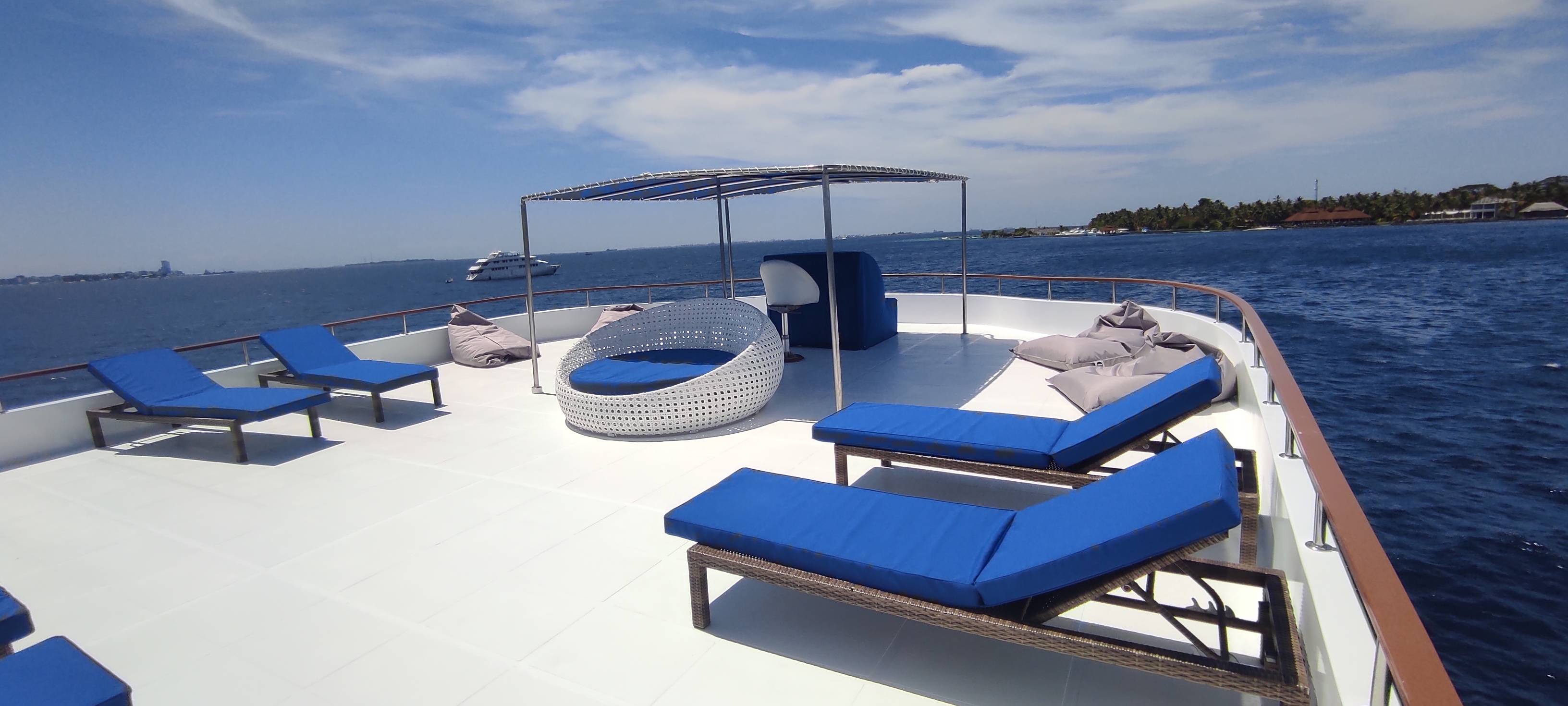 | Equipement | Dessalinisateur (10 000L / jour), grand salon intérieur avec bar et TV, un salon extérieur avec sofas, sundeck avec transats, un SPA. Les repas, seront pris sur le pont arrière. |